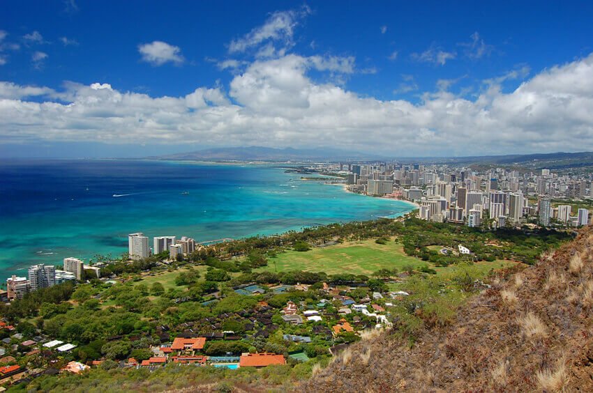Oahu’s temperatures stay mild year round between 68 and 85 degrees Fahrenheit (20-29.4 C). Winter months (November to April) are a bit cooler with more frequent precipitation. Cooling trades work wonders to keeping the island pleasantly comfortable. Visitors love the warm temperature of the coastal waters, which average around 76 to 78 degrees (24.4-25.5 C). Oahu is home to two monumental mountain ranges, the Koolau Mountains, which reach along the northeastern side, and the Waianae Mountains which lay to the west.