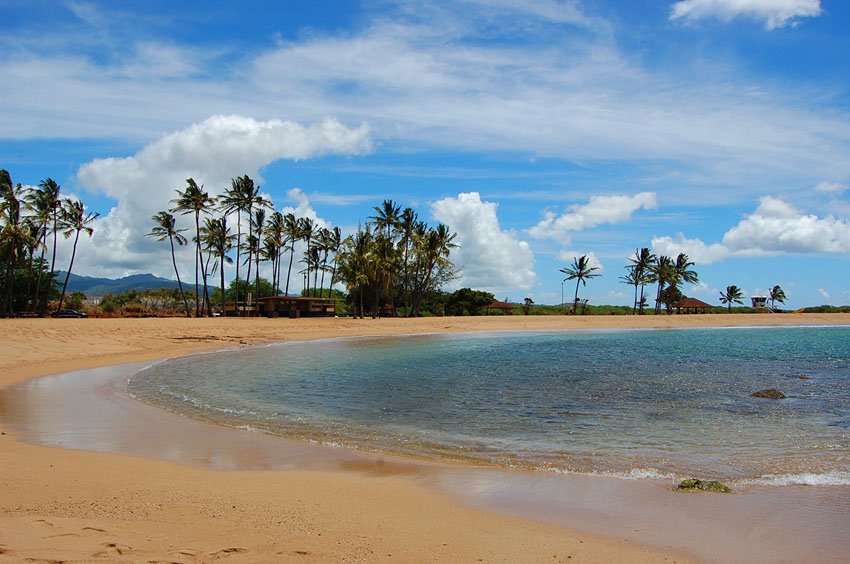 Salt Pond Beach Park is a wide, reddish-golden sand pocket beach on Kauai's south shore that is generally safe for swimming year-round. At both ends of the beach are rocky outcrops; a natural rock ridge connects the outcrops, creating a small lagoon. This pool-like area is where families with children like to swim. The beach is usually safe for swimming, except during times of high surf, when rip currents form in the channels between the rock barriers.