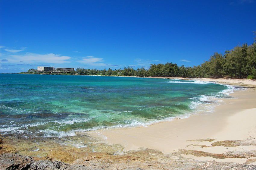 The upscale Turtle Bay Resort is located next to this bay. Most resort guests prefer to swim at neighboring Kuilima Cove because it offers easier access to the water (it has a sandy patch in the nearshore waters) and the beach is more protected from high surf due to an offshore reef. So overall, the beach at Turtley Bay is only sparsely visited. It is perfect if you a looking for a relaxing spot for a picnic. Ironwood trees line the backshore and provide plenty of shade.